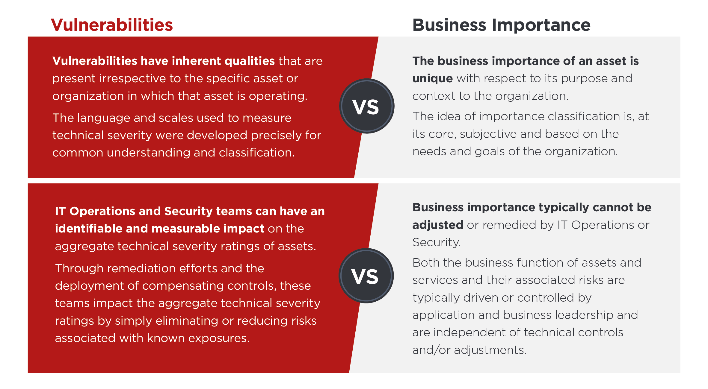 • Understanding the business value and potential consequence associated with an asset or business service cannot be adequately measured on the same scale as vulnerabilities. Measured on its own and independently calculated, business context can more accurately express both the value and risk associated with an organization’s assets and services.